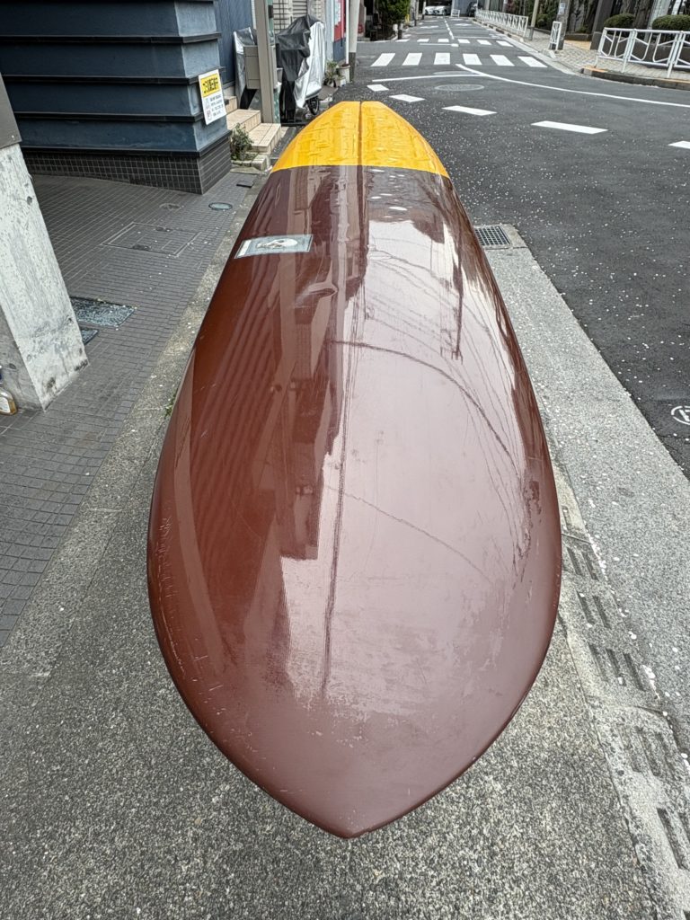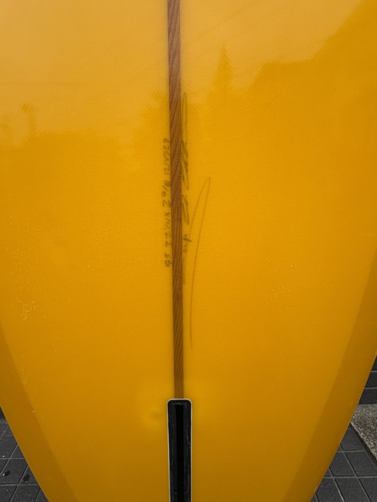 初期型の C-HAG です。アウトラインはpigベースです。ステップデッキを採用しているのでノーズエリアが軽く取り回しが容易で、ノーズライド時のコントロール性能も高いです。ピンテールと違うコントロールの良さがあるターン性能とノーズライディングのコンビネーションが楽しめる柔軟で反応の良いモデルです。